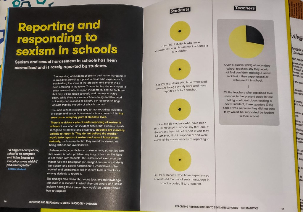 The course allowed everyone to share any experiences of discrimination or judgement they had experienced or heard of. Allowing us to discuss policies implemented by the NEU to protect all women’s rights, such as a model menopause policy. An important part of the course was learning about the extent of Sexism in education, by learning about the research carried out by the NEU and UK Feminista. We were provided with a very informative yet easy-to-understand report on the different types of sexism experienced by students and teachers in UK schools, how this is reported, and what we can do to notice and eradicate this.